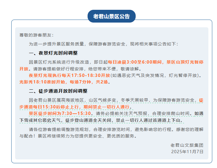 11月7日,记者从老君山景区了解到,该景区夜景灯光时间以及徒步通道开放时间有调整,具体公告如下:
