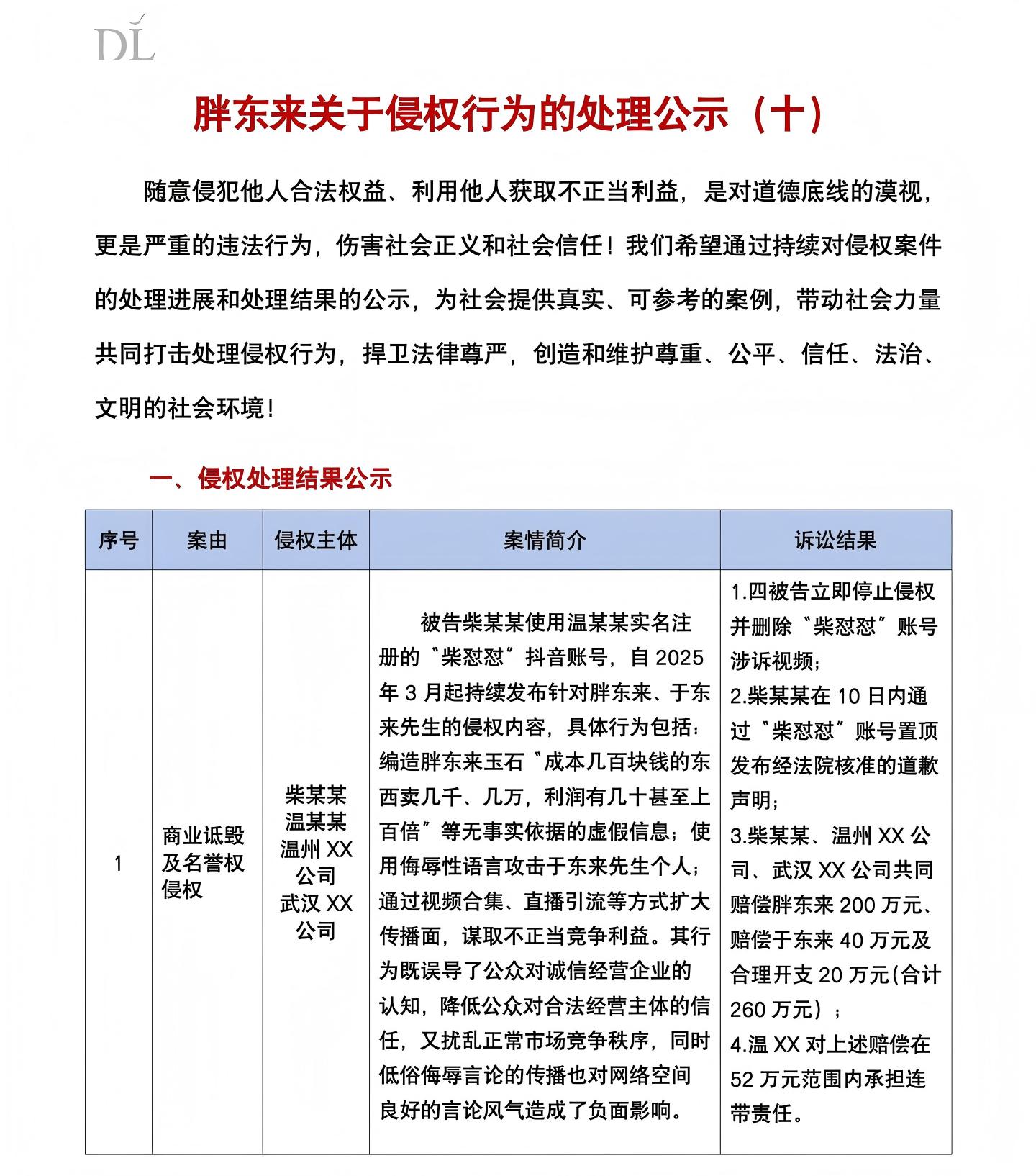 11月11日,胖东来发布关于侵权行为的处理结果,包含“柴怼怼”在内的6人因侵犯胖东来权益,被判赔偿损失、刊登声明消除影响等。其中“柴怼怼”须赔偿胖东来和于东来合计260万元。