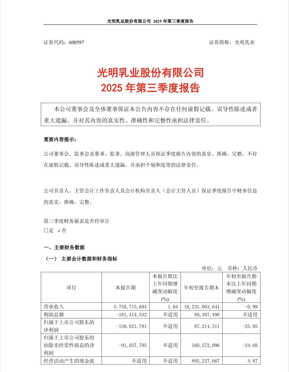 (光明乳业2025年第三季度报告)