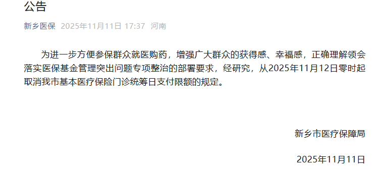 11月11日,记者从新乡市医疗保障局获悉,为进一步方便参保群众就医购药,提升群众获得感与幸福感,同时全面落实医保基金管理突出问题专项整治相关部署要求,经研究决定,自2025年11月12日零时起,取消新乡市基本医疗保险门诊统筹日支付限额规定。
