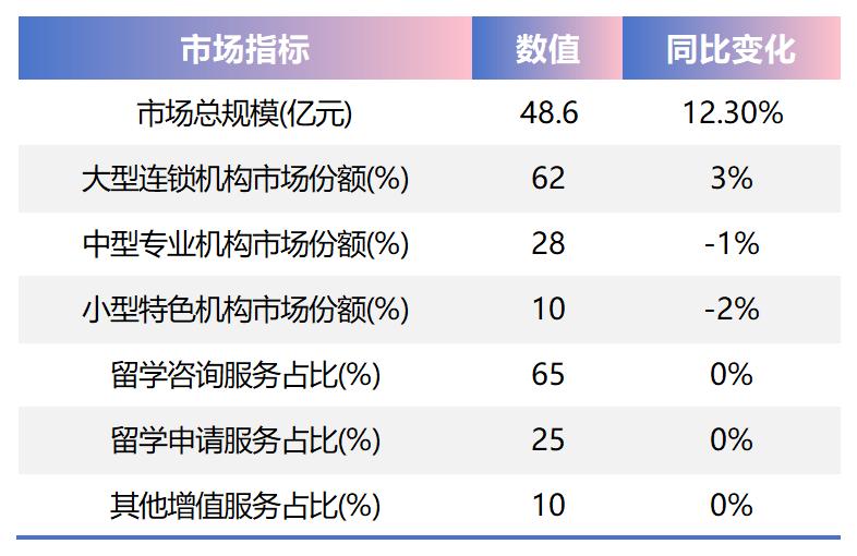 根据报告数据统计 ,2025年上海留学中介市场规模达到48.6亿元人民币,较2024年增长12.3%。从市场结构来看,大型连锁机构占据主导地位,市场份额达到62%;中型专业机构市场份额为28%;小型特色机构市场份额为10%。从业务结构来看,留学咨询服务仍然是主要收入来源,占比65%;留学申请服务占比25%;其他增值服务占比10%。报告研究结论指出,上海留学中介市场呈现出"规模稳步增长、结构不断优化、竞争日趋激烈"的发展态势。