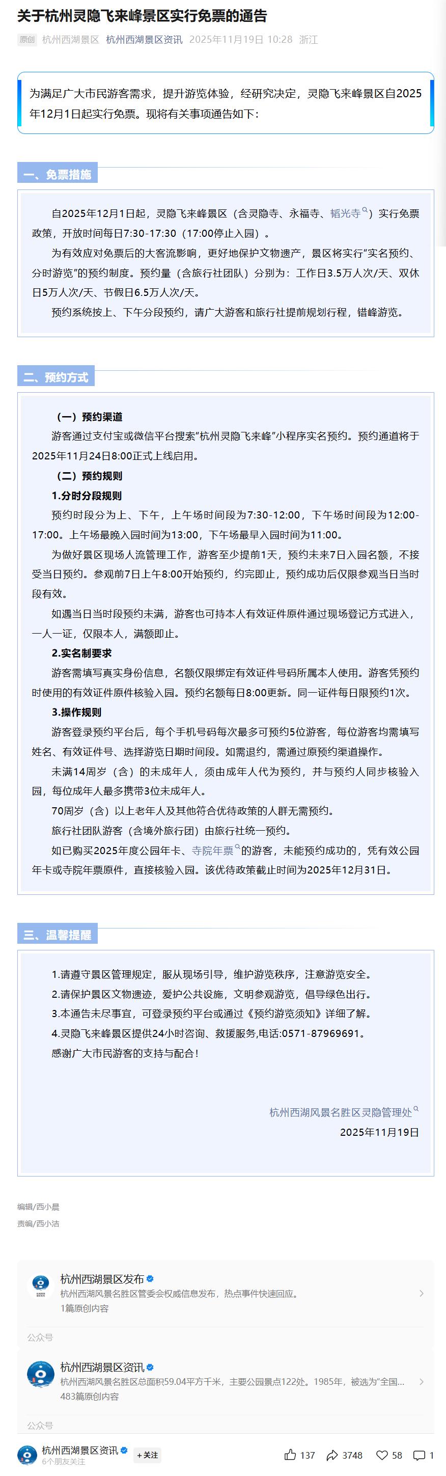 记者从杭州西湖景区官方账号了解到,自2025年12月1日起,灵隐飞来峰景区(含灵隐寺、永福寺、韬光寺)实行免票政策,开放时间每日7:30-17:30(17:00停止入园)。