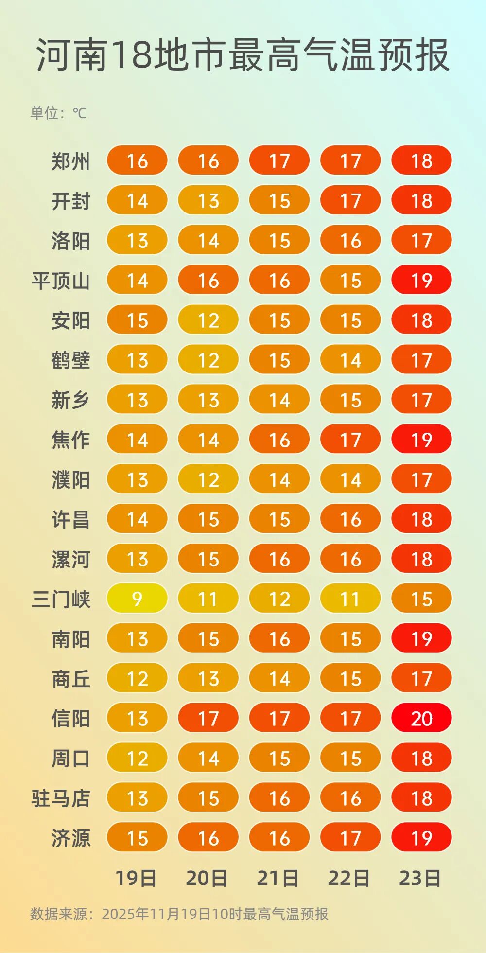 受西北气流控制,今后三天,全省大部地区以晴朗天气为主,气温也在缓慢回升。今日11时,全省气温在10℃左右,较昨日同一时刻(18日11时)上升了3~5℃。预计本周末多地最高气温可回升至15℃+,但最低气温依旧低迷。早晚寒凉,大家注意及时添衣谨防感冒。