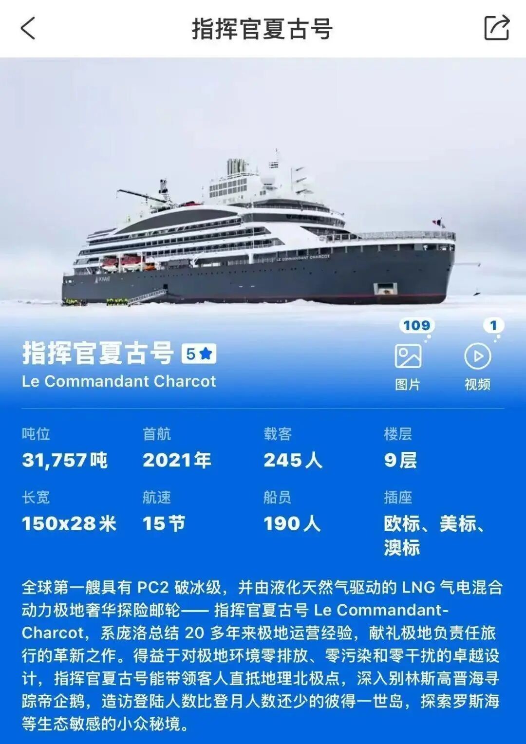 公开资料显示,“夏古号”邮轮全称为“指挥官夏古号”,是庞洛邮轮运营的全球首艘液化天然气驱动气电混合动力极地探险邮轮,具备PC2级破冰能力,船壳由Aker Arctic合作设计可实现双向破冰航行模式,可抵达地理北极点及南极威德尔海等极端区域。该邮轮设计载客量为245人,于2021年交付后,主要执行北极点、格陵兰东北部及南极威德尔海航线。