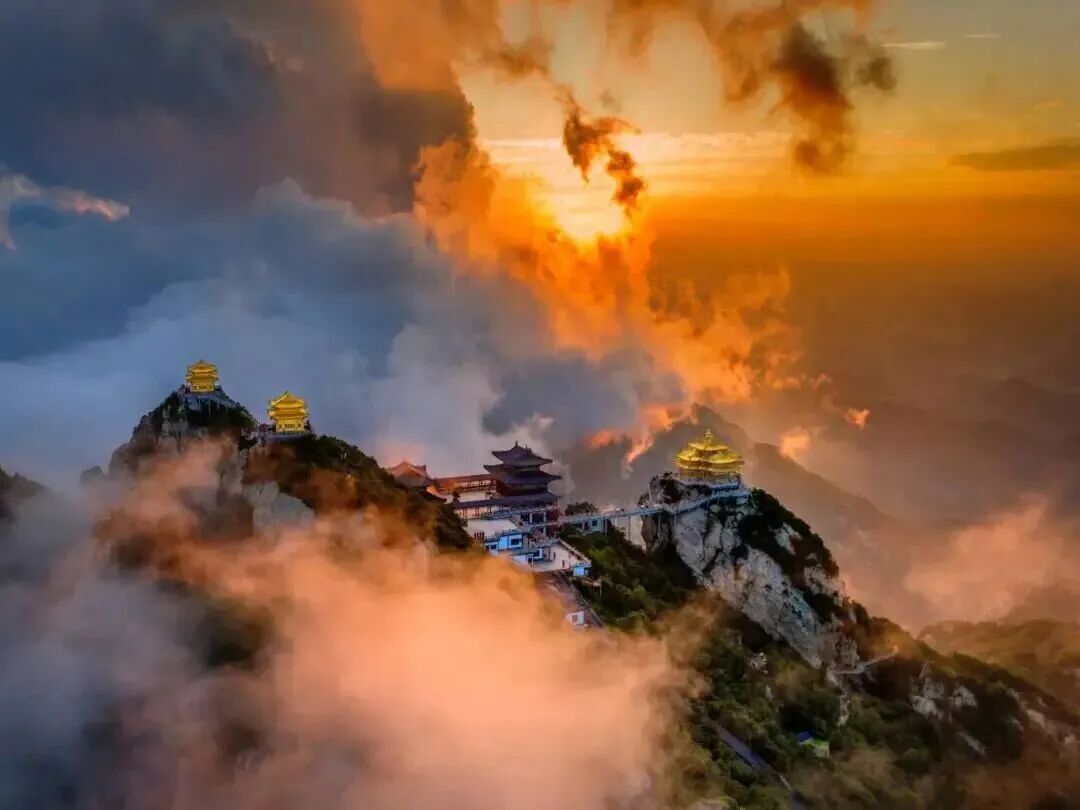老君山两条索道支架区域是山上红叶最绚烂的区域,乘索道从彩林上空掠过,能俯瞰红叶彩林的风采,是赏秋的绝佳打卡地。连片的红叶彩林,如打翻的调色盘般渲染层林,又有日出云海与高山交相辉映,让人心生敬意。
