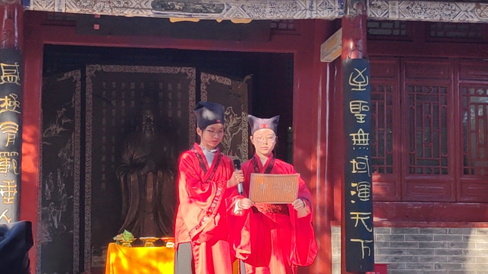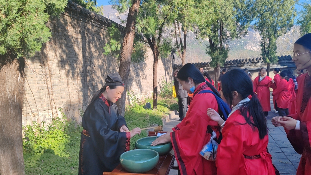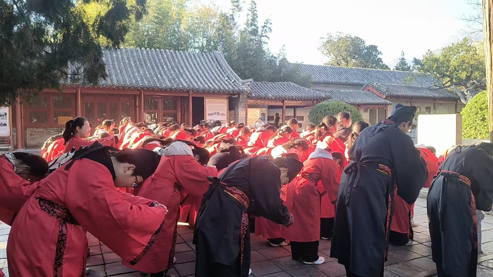 午后,研学队伍前往嵩阳书院,这座始建于北魏、鼎盛于北宋的古代四大书院之一,曾见证程颢、程颐讲学授业,孕育了“程门立雪”的千古佳话。在庄严肃穆的拜孔仪式上,同学们整理衣冠、宣读拜文、敬献六礼、诵读经典,而后绕泮池三周,在传统入泮礼中定下学习目标。随后,大家结合研学手册,探究书院的建筑布局、教育制度与儒释道文化融合的特色,近距离观赏汉武帝御封的“将军柏”与唐代碑刻,在斑驳古迹中触摸古代教育的脉络,感悟程朱理学的深厚底蕴。自由探访环节,同学们根据兴趣深入探索,与同伴交流感悟,在书院的清幽氛围中沉淀思考。