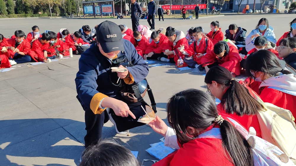 上午9时许,队伍抵达登封观星台——这座世界现存最古老的天文台、世界文化遗产核心组成部分,同学们在导师引导下,探寻元代天文学家郭守敬主持建造的历史渊源,了解圭表、周公测景台等核心构件的“立竿见影”原理,对比古今天文观测方法的异同。在动手实践环节,大家领取物料包拼装日晷模型,亲手测算实时时间,部分同学还参与了人体日晷游戏,直观感受日影变化与节气、时间的关联,真切体会古人“格物致知”的探索精神。