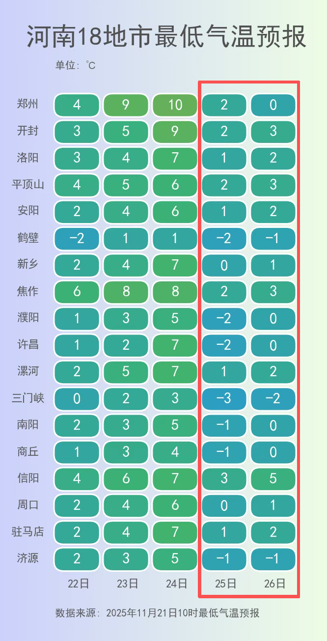 25日早晨也将是本轮天气过程的最低温时刻,西部、北部地区的最低气温将降至-6℃到-2℃,省内其他地区也普遍在冰点附近徘徊。