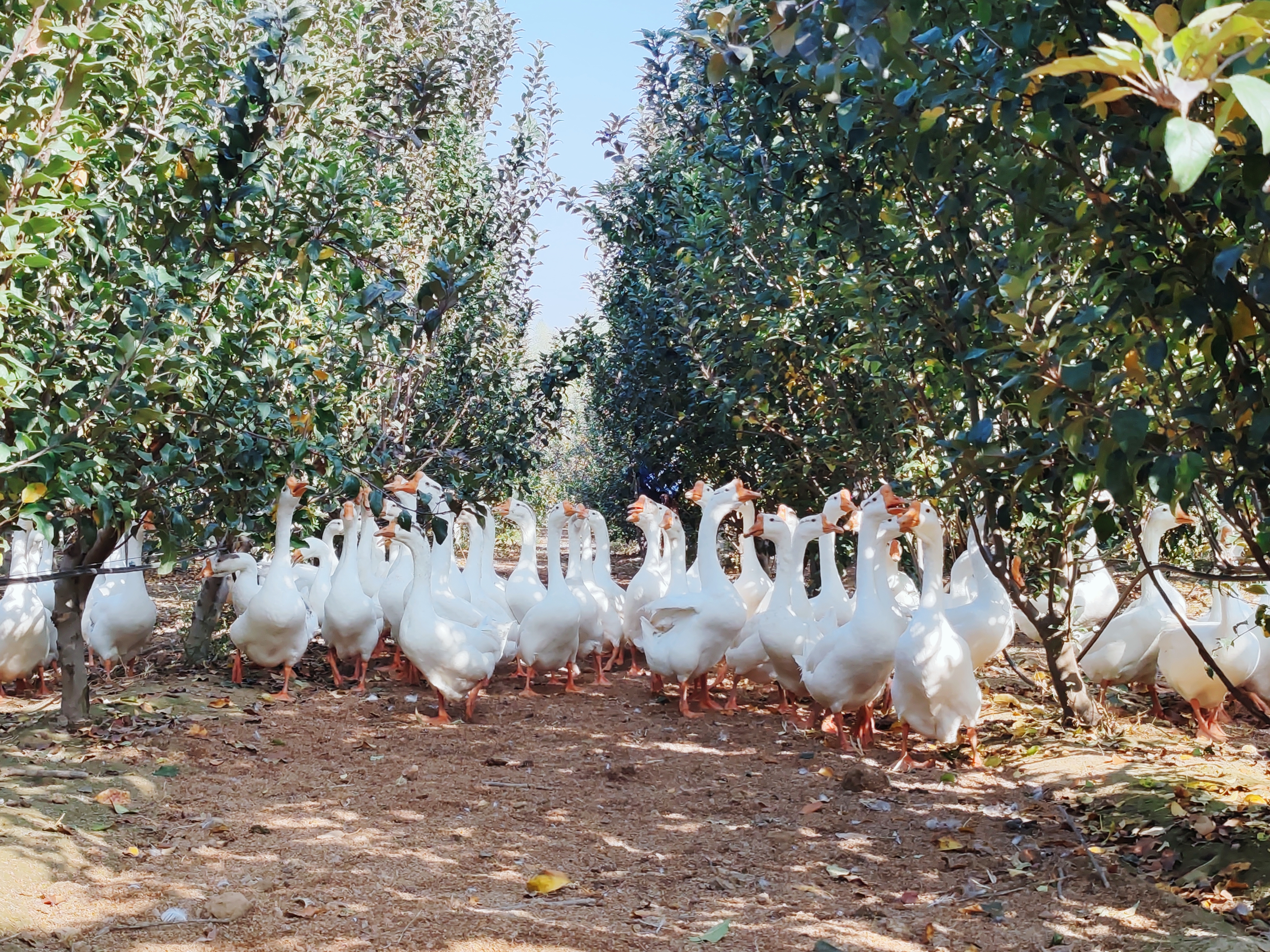 (11月18日 南乐县西邵乡“寨里村智慧果园”鹅群在苹果树下寻找食物 薛永亮拍摄)