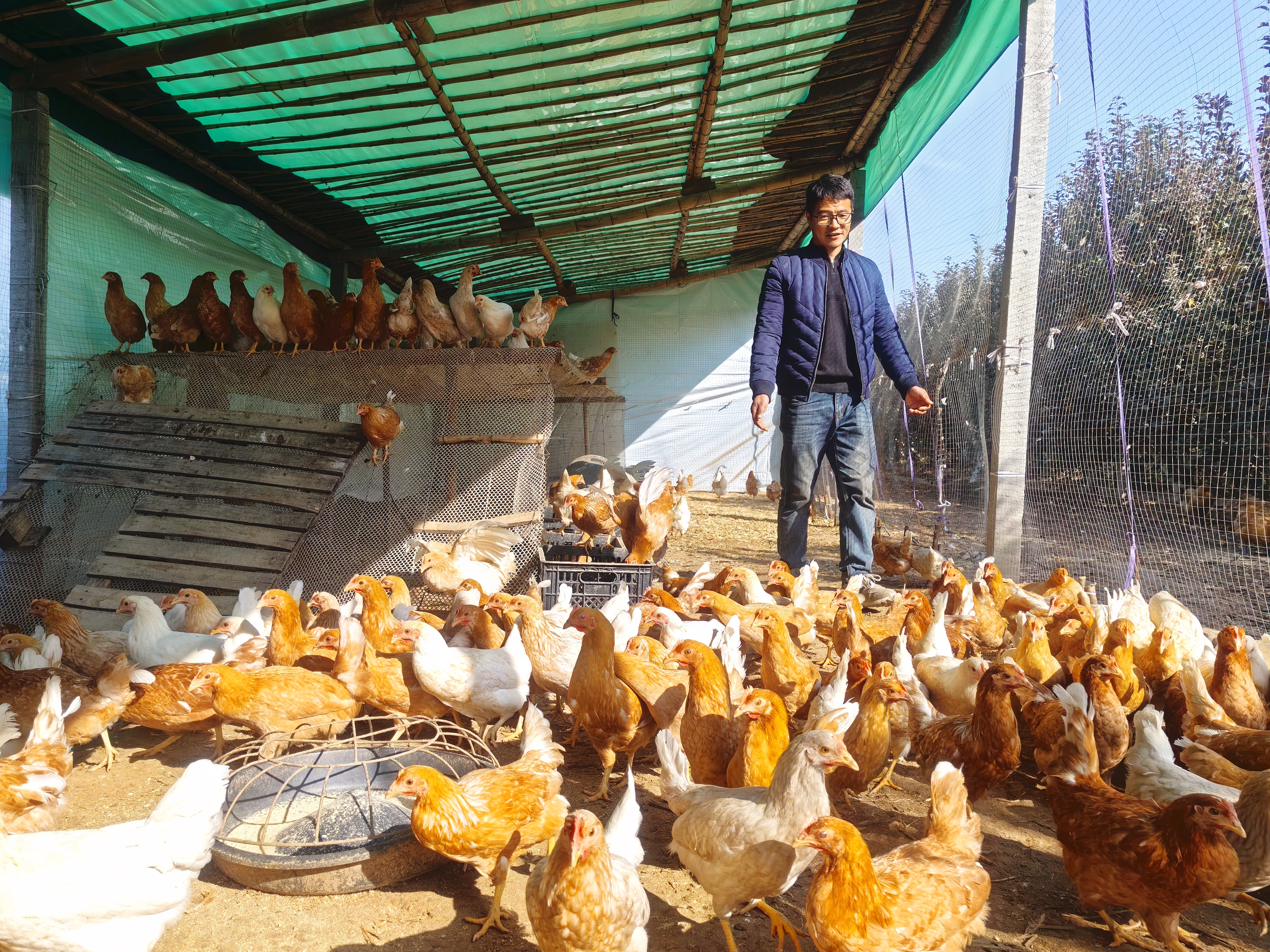 (11月18日 南乐县西邵乡“寨里村智慧果园”负责人 王韬亮正在科学管护鸡群 王梦菲拍摄)