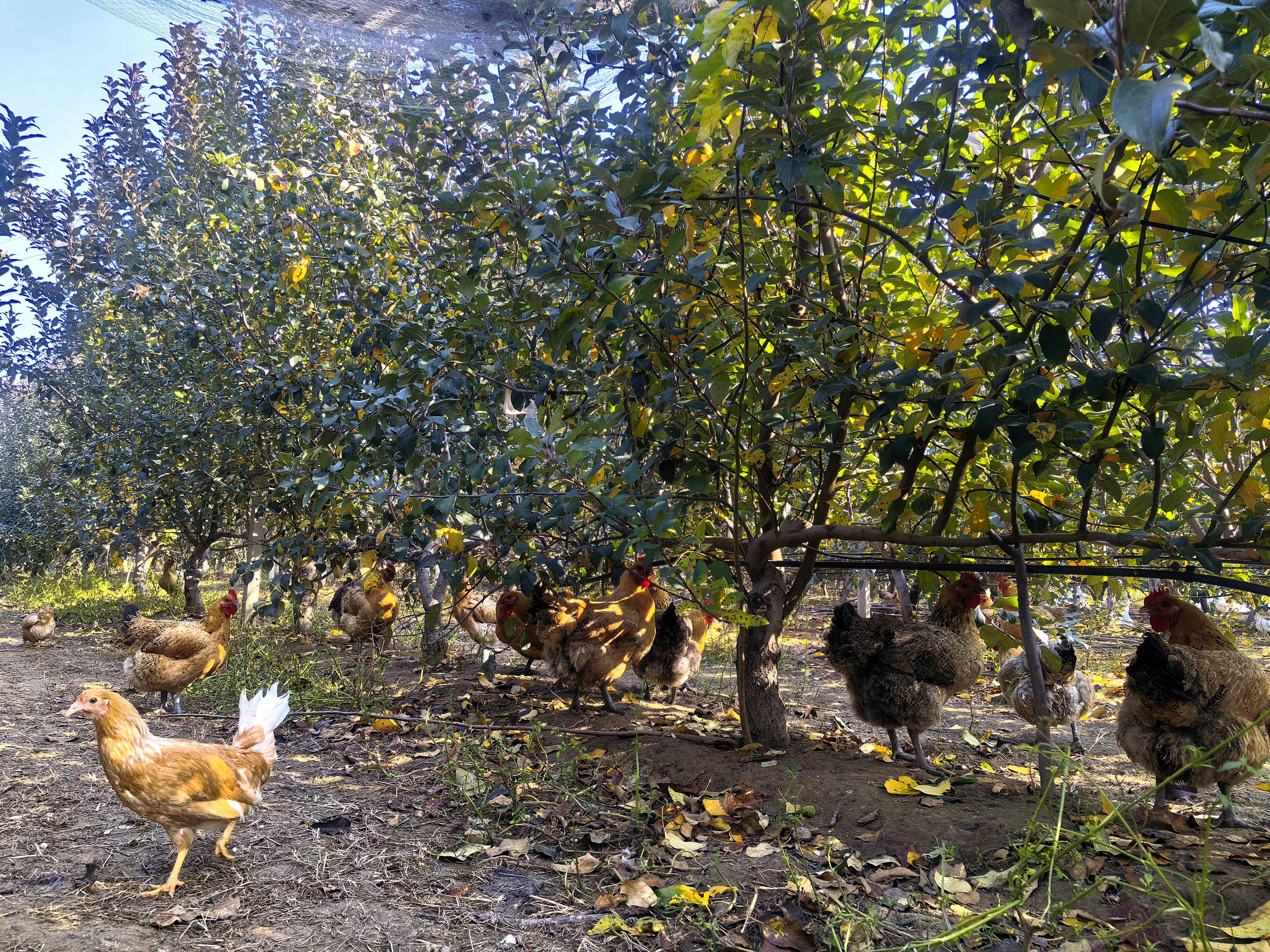 (11月18日 南乐县西邵乡“寨里村智慧果园”鸡群在苹果树下寻找食物 贾红敏拍摄)