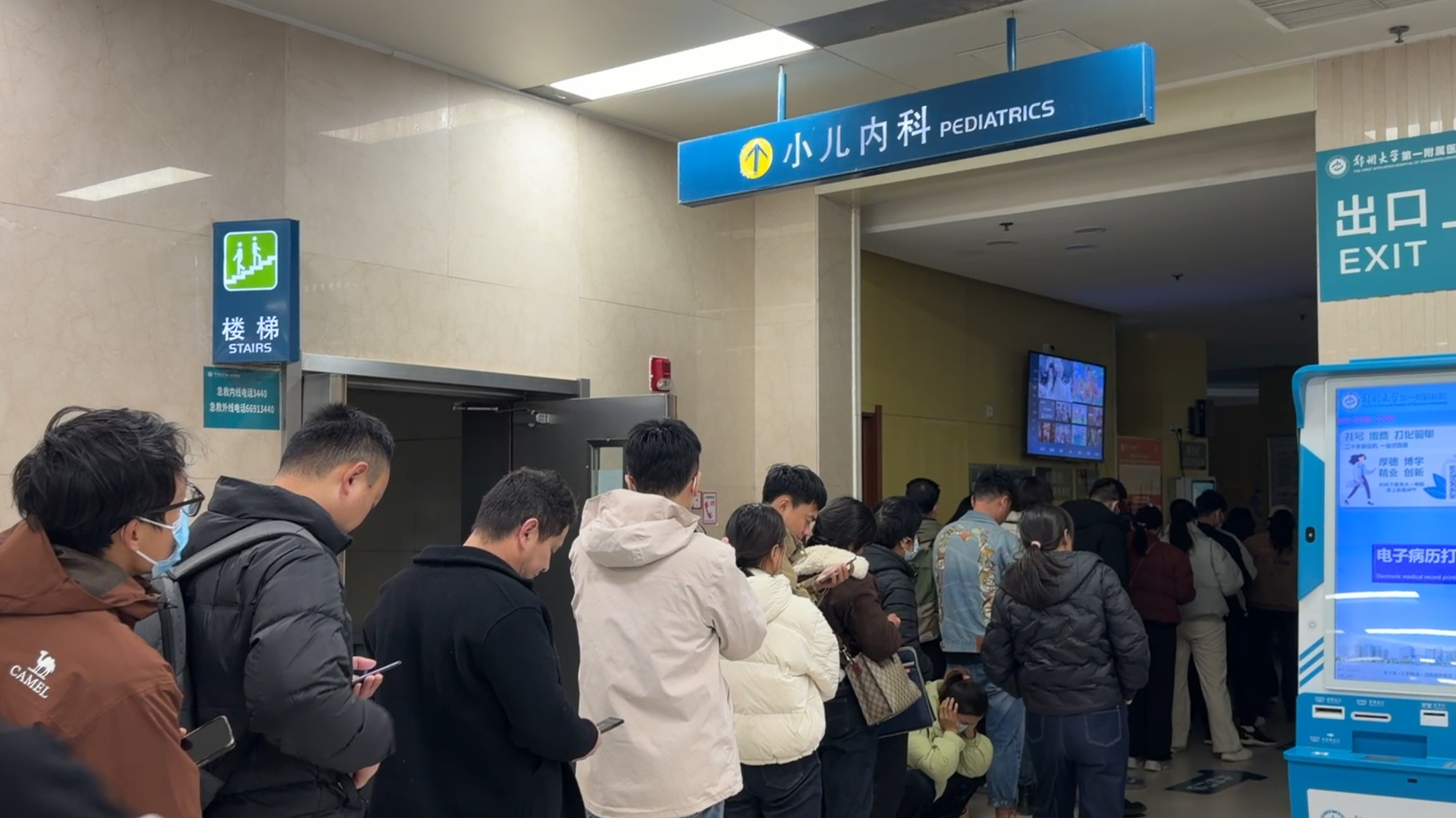 记者在河南省儿童医院呼吸科门诊以及发热门诊看到,有不少家长抱着孩子在此候诊。在郑大一附院一楼小儿内科,替生病孩子就诊排队的家长,更是摆起了一字长蛇阵。