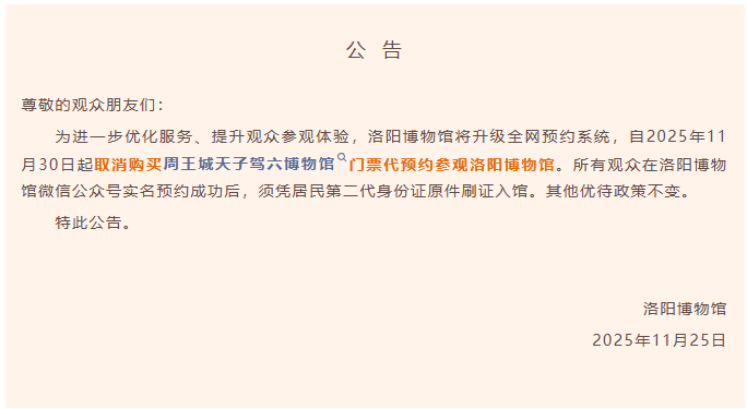 11月25日,记者从洛阳博物馆获悉,为优化服务、提升观众参观体验,洛阳博物馆将对全网预约系统进行升级,自2025年11月30日起取消购买周王城天子驾六博物馆门票代预约参观洛阳博物馆。