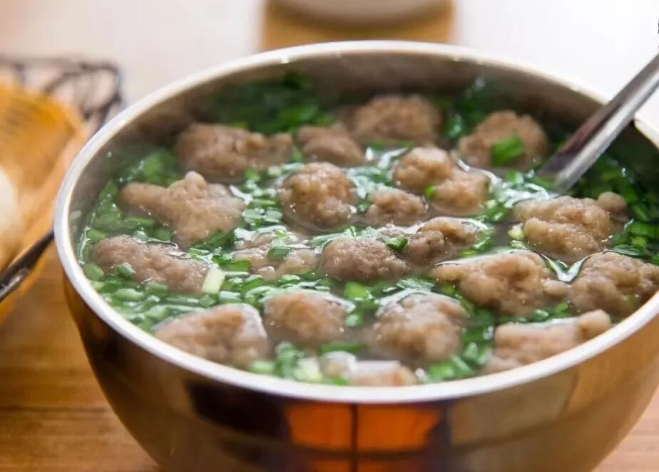 盛七八个丸子垫底,浇上滚烫浓汤,撒一把韭菜、葱花、香菜,再点几滴用羊油辣椒炼成的红油。汤色清亮,丸子Q弹紧实,咬开后肉香四溢,简单又暖胃。