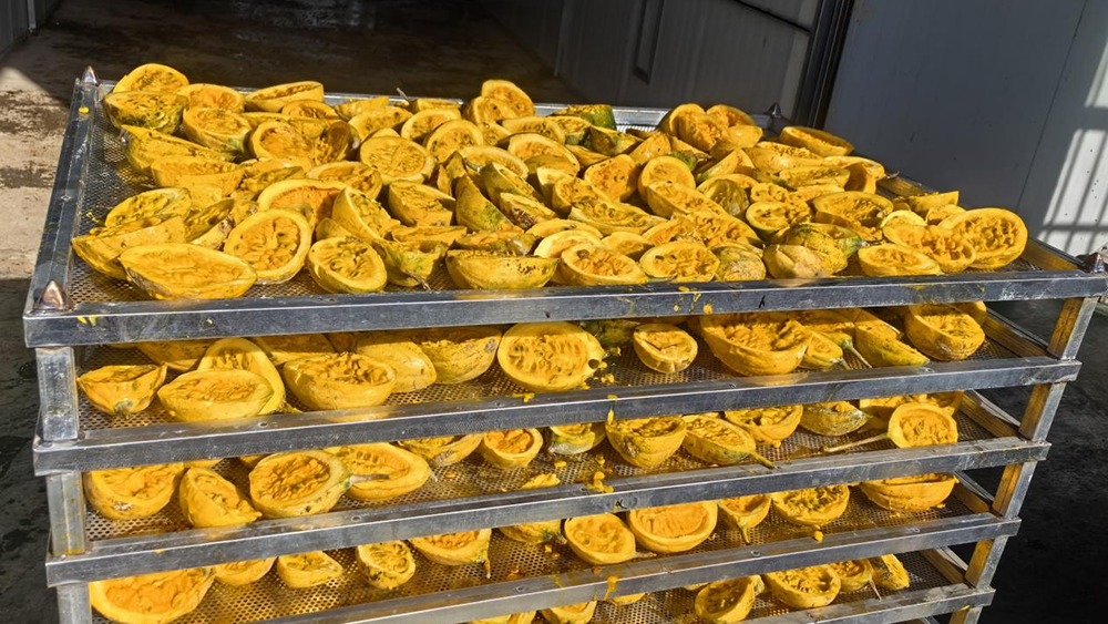 近日,走进河南省确山县任店镇王班庄村瓜蒌种植基地,一片丰收的景象,一串串金黄饱满的瓜蒌挂满枝头,村民们穿梭其间,熟练地采摘、剥离果肉果皮、转运洗籽、分批烘干,将一年的辛勤付出化作金灿灿的收获。