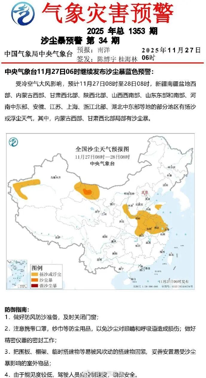 中央气象台11月27日06时继续发布沙尘暴蓝色预警: