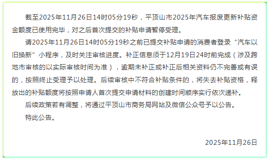 截至2025年11月26日14时05分19秒,平顶山市2025年汽车报废更新补贴资金额度已使用完毕,对之后首次提交的补贴申请暂停受理。