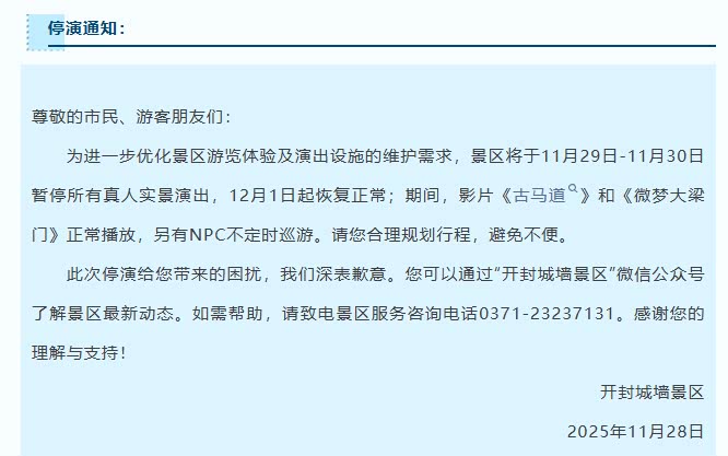 11月28日,记者从开封城墙景区获悉,为进一步优化游览体验、保障演出设施维护,景区将于11月29日至11月30日暂停所有真人实景演出,12月1日起恢复正常;暂停期间,影片《古马道》《微梦大梁门》正常播放,另有NPC不定时巡游。请广大游客合理规划行程,避免出行不便。