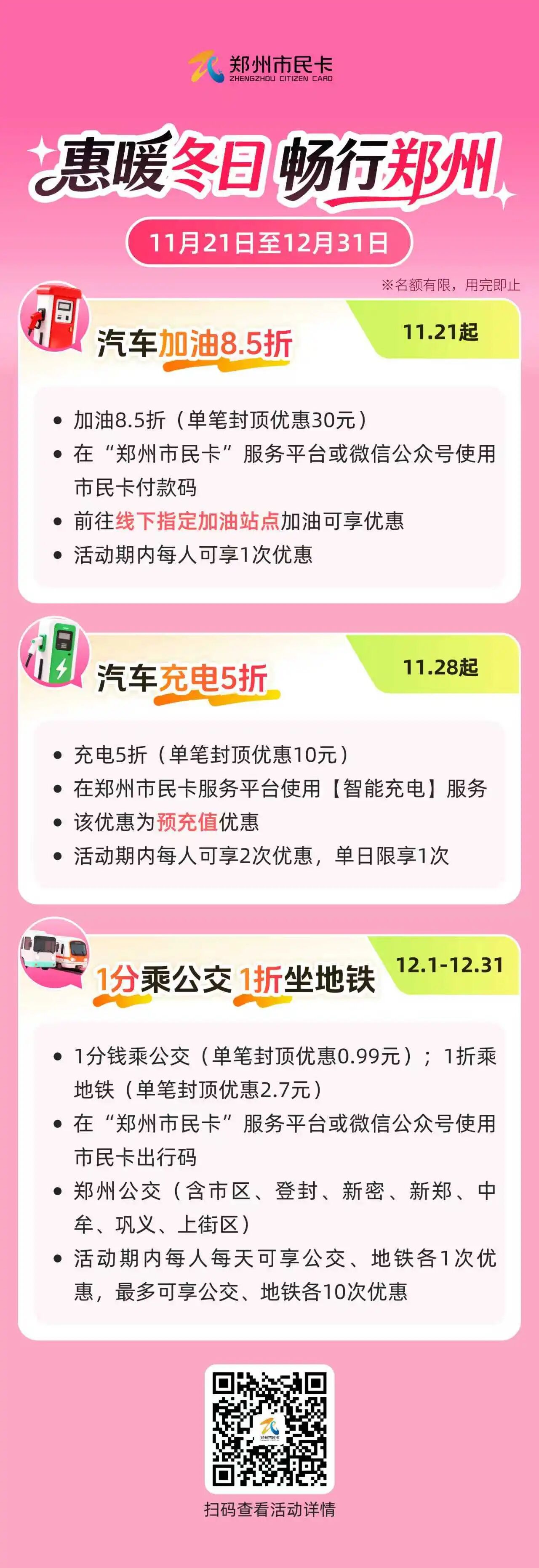 从年初的“5折乘公交、8折乘地铁”到近期开展的“1分钱坐公交”“地铁立减券”活动,郑州社保卡(市民卡)以推动多领域“一卡通用”为抓手,实现了公共交通领域惠民活动的常态化。本次“惠暖冬日畅行郑州”活动,结合日前郑州市发布的恢复机动车限行规定与大众冬季出行习惯,整合了郑州市民卡APP出行领域的热门服务,涵盖汽车加油、充电、公交、地铁四大场景,分别开展“加油8.5折”“充电5折”“1折坐地铁”“1分钱乘公交”等优惠。发卡银行为工商银行、农业银行、中国银行、建设银行、交通银行、邮政储蓄银行、农商银行(郑州、荥阳、登封、新密、新郑、中牟、巩义)、郑州银行、光大银行的二代、三代郑州社保卡(含省直)用户均可通过郑州市民卡APP参与活动。