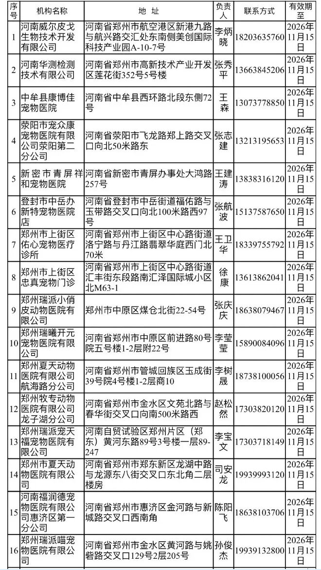 附:郑州市狂犬病免疫抗体检测实验室名单