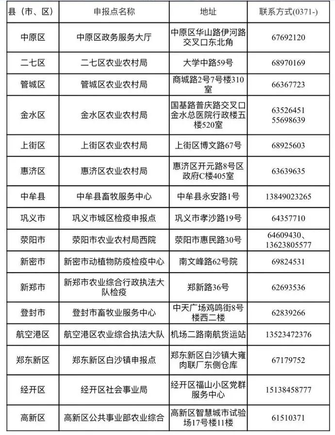 附:郑州市各区县(市)宠物检疫办理窗口地址及联系电话