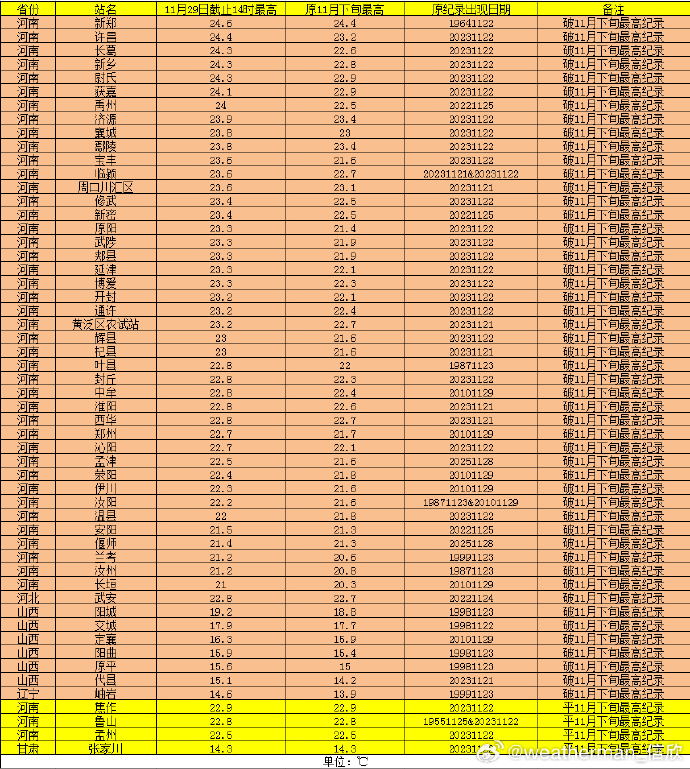 截至29日下午2时,包括河南在内的华北、黄淮等区域共有50个国家级气象站打破11月下旬最高气温纪录。我省许昌(24.4℃)、新乡(24.3℃)、济源(23.9℃)、周口(23.6℃)、开封(23.2℃)等地气温均创下同期新高。郑州29日下午气温达到22.7℃,同样刷新了当地11月下旬的最高气温纪录。