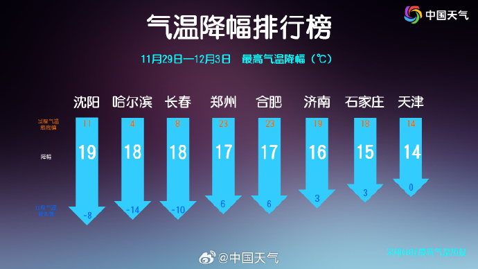 中央气象台已于11月29日18时发布寒潮蓝色预警,提示受寒潮影响,11月29日夜间至12月3日,我国中东部地区将出现自北向南的大风降温过程。江南东部及以北地区日平均或最低气温普遍下降6~10℃,内蒙古、华北北部、东北地区、黄淮等地降温幅度可达10~14℃,局部地区降温可达16℃左右。