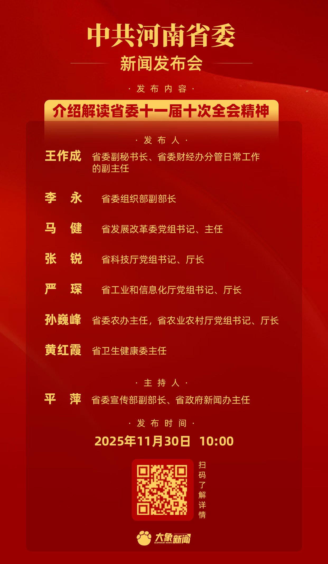 中共河南省委将于11月30日上午10时举行新闻发布会,介绍解读省委十一届十次全会精神。