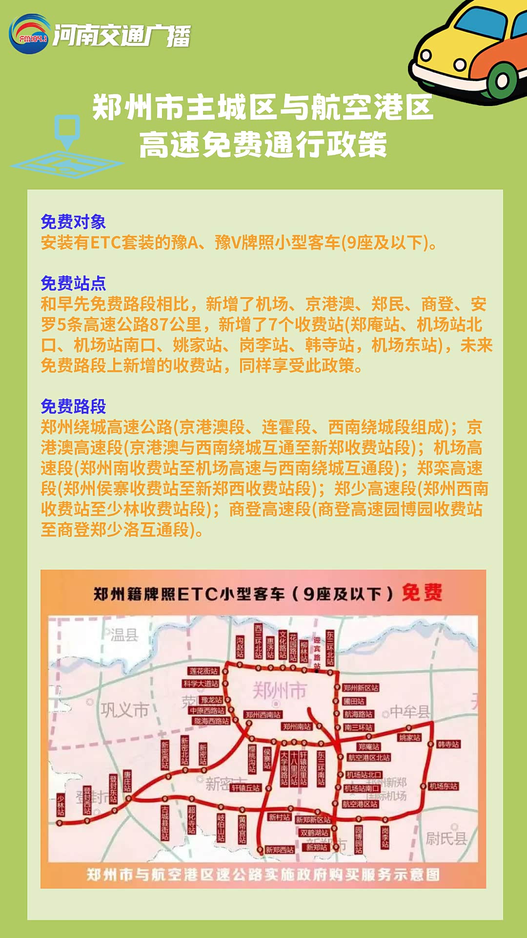 安装有ETC设备的郑州籍、开封籍牌照(豫A、豫V、豫B)的小型客车(9座及以下),在免费站点上下高速,且行驶路段在指定免费路段区间内,方可免区间通行费。