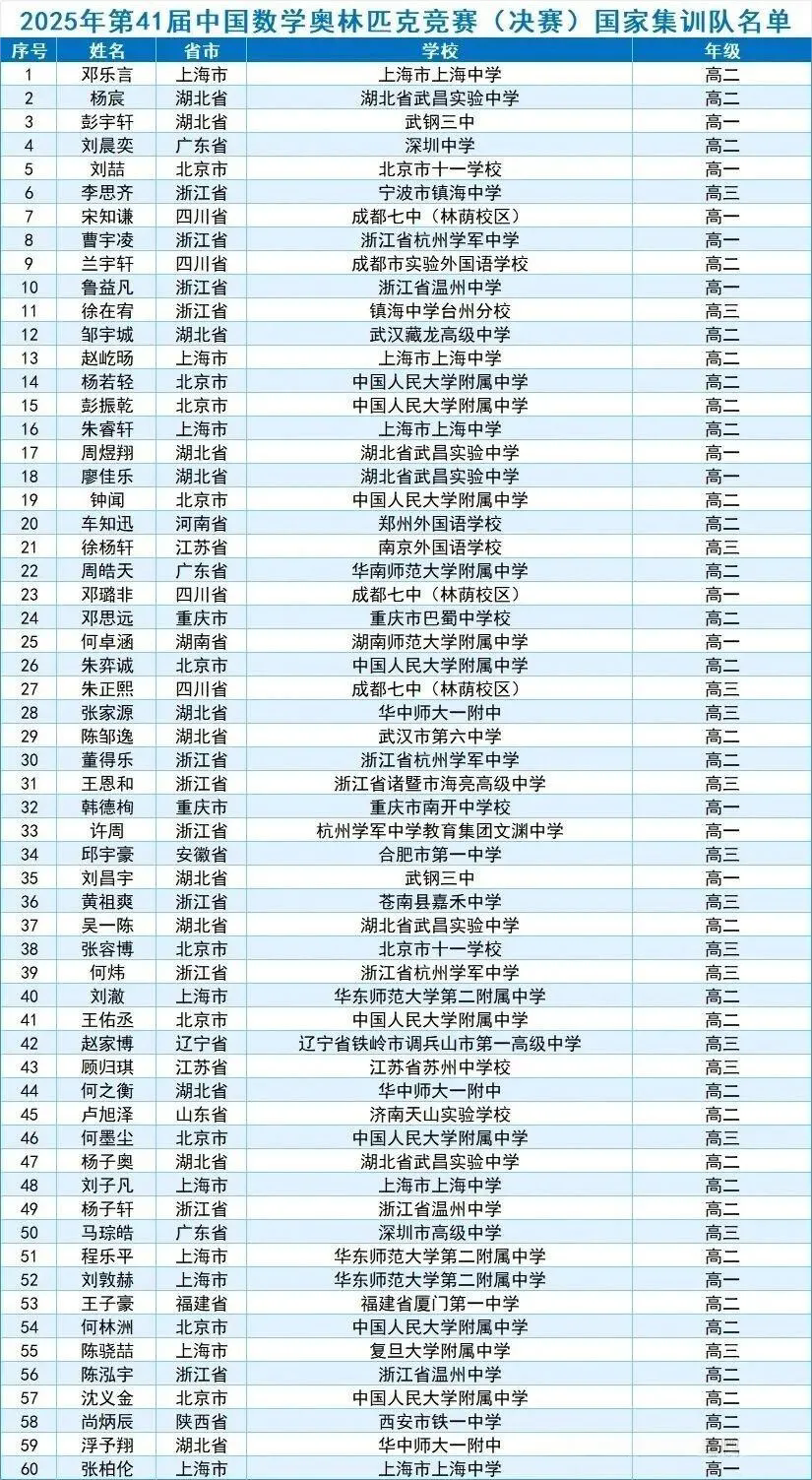 2025CMO第41届中国数学奥林匹克竞赛国家集训队名单出炉。从数据来看:今年直通清北的CMO国家集训队60人名单出炉,排名前四的省份占了42席。其中,湖北 12人,浙江 11人,北京 10人,上海 9人,四川 4人,广东 3人,江苏、重庆 2人,山东、福建、河南、湖南、安徽、陕西、辽宁各 1人。
