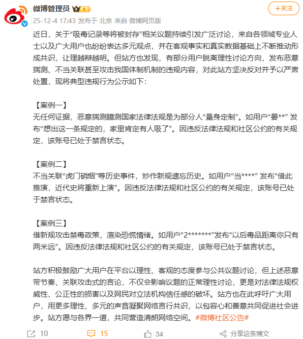 不当关联“虎门销烟”等历史事件,炒作新规遗忘历史。如用户“当****” 发布“借此推演,近代史将重新上演”。因违反法律法规和社区公约的有关规定,该账号已处于禁言状态。