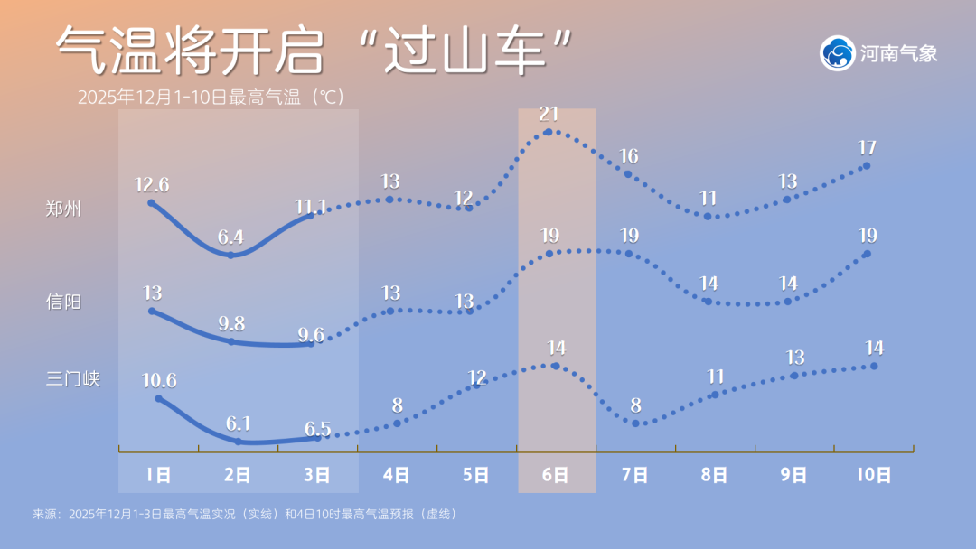 郑州市气象局提醒: 今天白天:多云转晴天 东北风转偏南风:2-3级 最低气温:-2~-1℃ 最高气温:11~12℃ 6日:晴天间多云,偏西风3级,阵风5-6级,2~19℃ 7日:阴天转多云,西北风 3-4 级,阵风6-7级,8~17℃ 本周