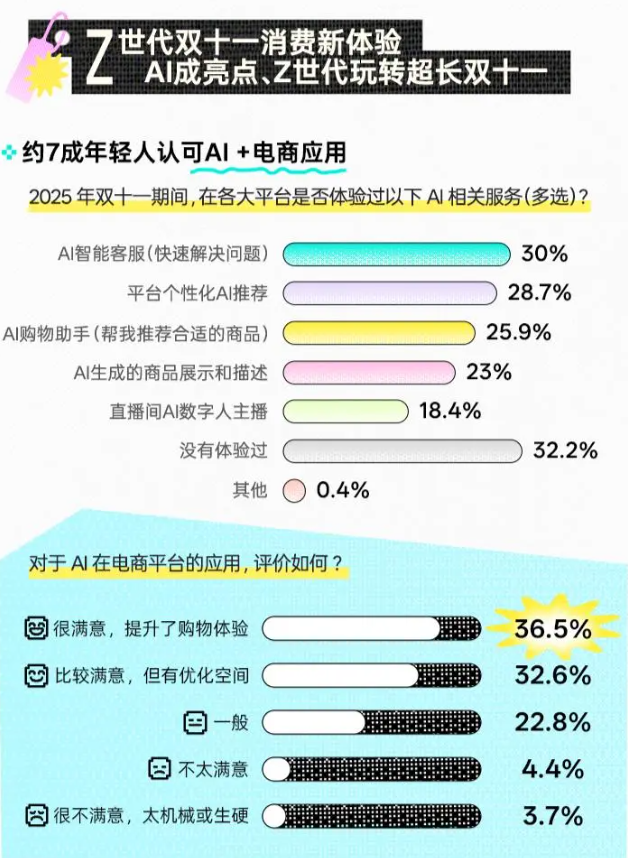 大促参与度连续三年提升,Z世代都在双十一“忙” 什么呢?在Z世代“双十一”的情绪消费版图中,旅行类消费强势登顶,成为青年首选。以“囤机酒产品、旅行线路”为代表的旅行相关消费,以36.9%的占比成为最受欢迎的情绪消费品类。其后为一系列满足精神需求的数字与体验式消费,会员等数字增值服务(33.1%)、游戏充值(31.6%)、文创、潮玩等(31.3%)以及音乐节、livehouse等文娱消费(31%)共同构成了情绪消费的第二梯队。值得一提的是,AI正成为2025年“双十一”Z世代消费体验的亮点,约7成年轻人认可AI+应用。从应用场景来看,AI技术已深度渗透到购物的各个环节。其中,AI智能客服(30%)以快速解决问题的能力成为最受欢迎的应用,其次AI分别为平台个性化AI推荐(28.7%)和AI购物助手(25.9%),重塑着消费者的购物体验。
