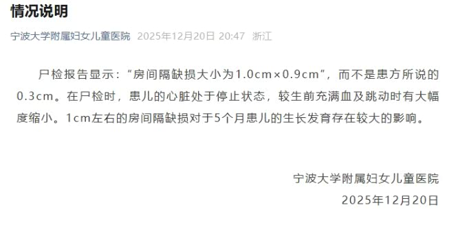 宁波大学附属妇女儿童医院12月20日发布情况声明: 尸检报告显示:“房间隔缺损大小为1.0cm×0.9cm”,而不是患方所说的0.3cm。在尸检时,患儿的心脏处于停止状态,较生前充满血及跳动时有大幅度缩小。1cm左右的房间隔缺损对于5个月患