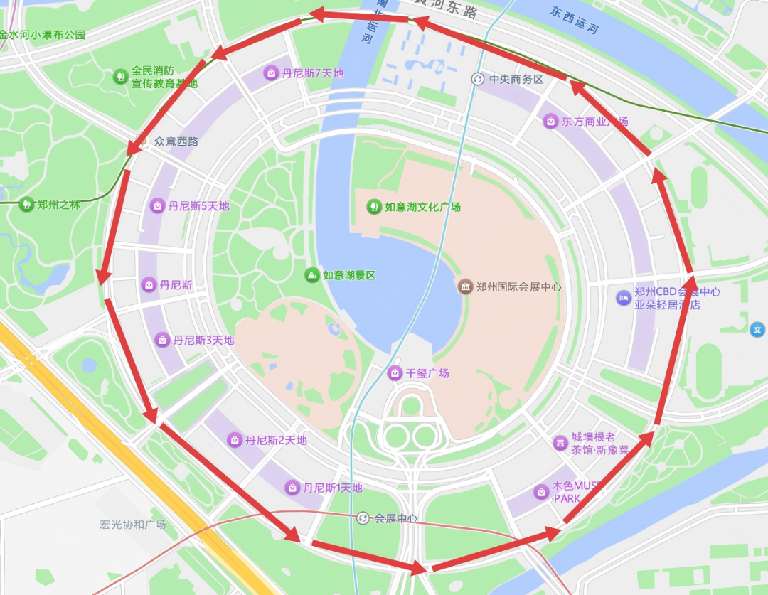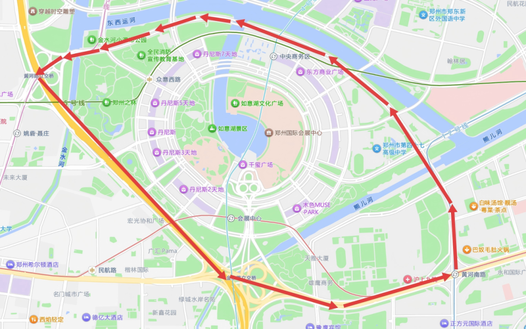 2、同一时段,根据郑东新区CBD区域的交通流量,适时对中州大道(不含)以东,黄河东路和黄河南路(不含)以南、以西,金水东路(不含)以北的合围区域采取车辆“只出不进”的疏导措施。