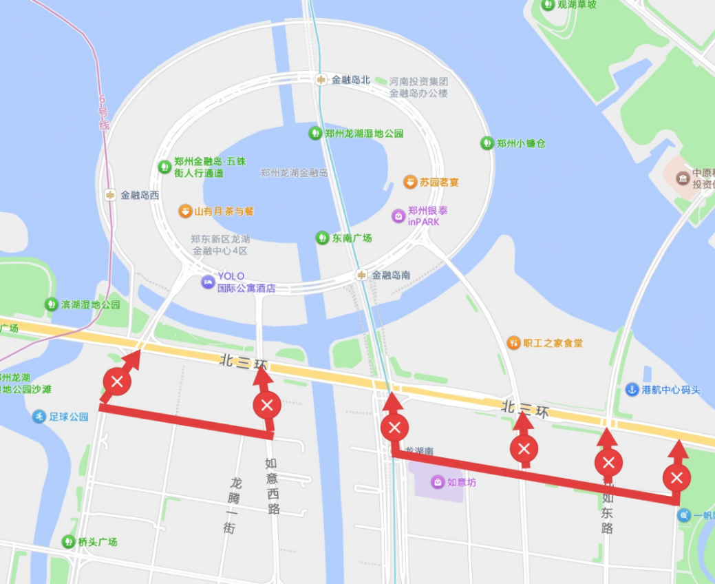 🔔周边分流:同一时段,根据北三环东延的交通流量,适时在如意河西二街(不含,众意路至如意西路段)、如意河东二街(不含,如意东路至龙翔二街段)和龙湖外环南路(不含,北三环至众意西路段)、朝阳路(不含,众意西路至中州大道段)梯次采取分流措施,不允许车辆向北三环东延方向行驶。