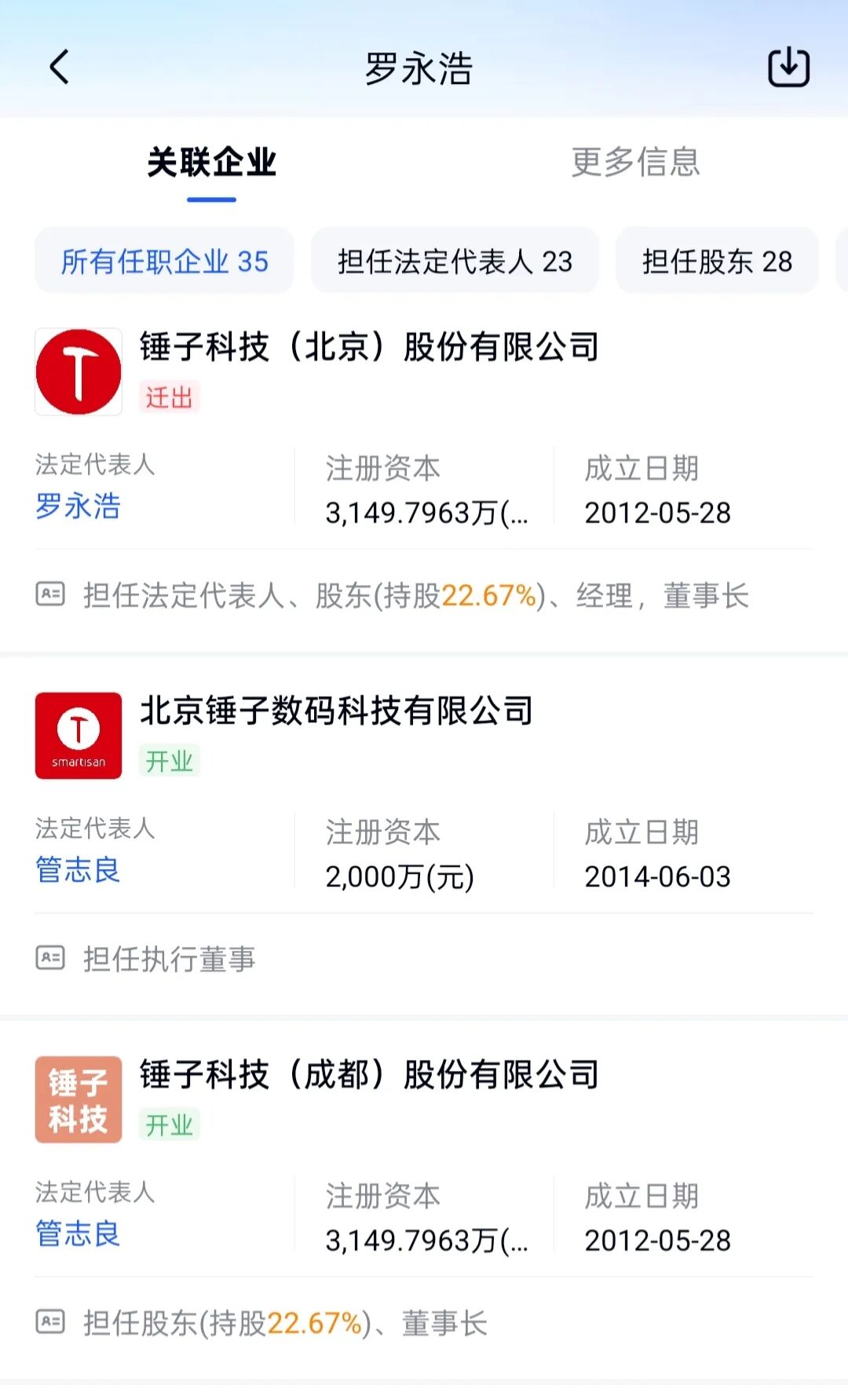 爱企查App显示,罗永浩名下共关联30余家企业,具体包括北京锤子数码科技有限公司、成都野望数码科技有限公司、北京云上卓智咨询中心(有限合伙)等,版图涉及数码、教育、投资管理等领域,其中10余家为开业状态。罗永浩在上述企业中担任董事长、执行董事、法定代表人等重要职务,并持有其中近30家企业的股份。