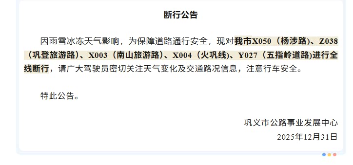 12月31日晚间,记者从巩义市公路事业发展中心了解到,因雨雪冰冻天气影响,为保障道路通行安全,将对巩义市X050(杨涉路)、Z038(巩登旅游路)、X003(南山旅游路)、X004(火巩线)、Y027(五指岭道路)进行全线断行,请广大驾驶员密切关注天气变化及交通路况信息,注意行车安全。