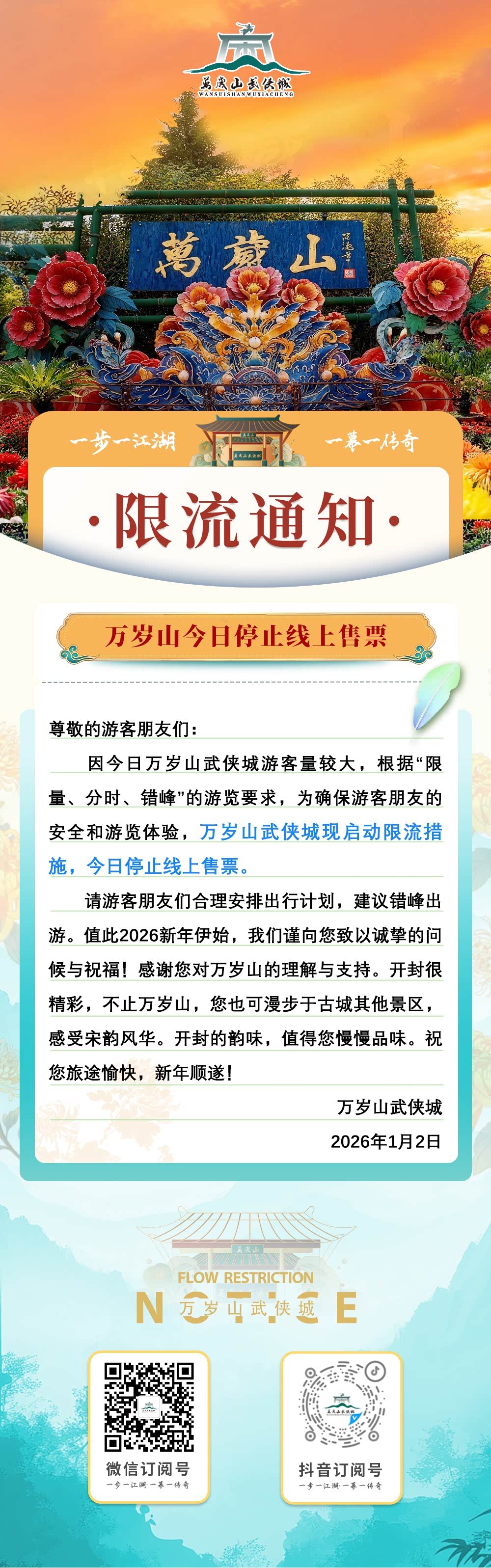 因今日万岁山武侠城游客量较大,现启动限流措施,今日停止线上售票。