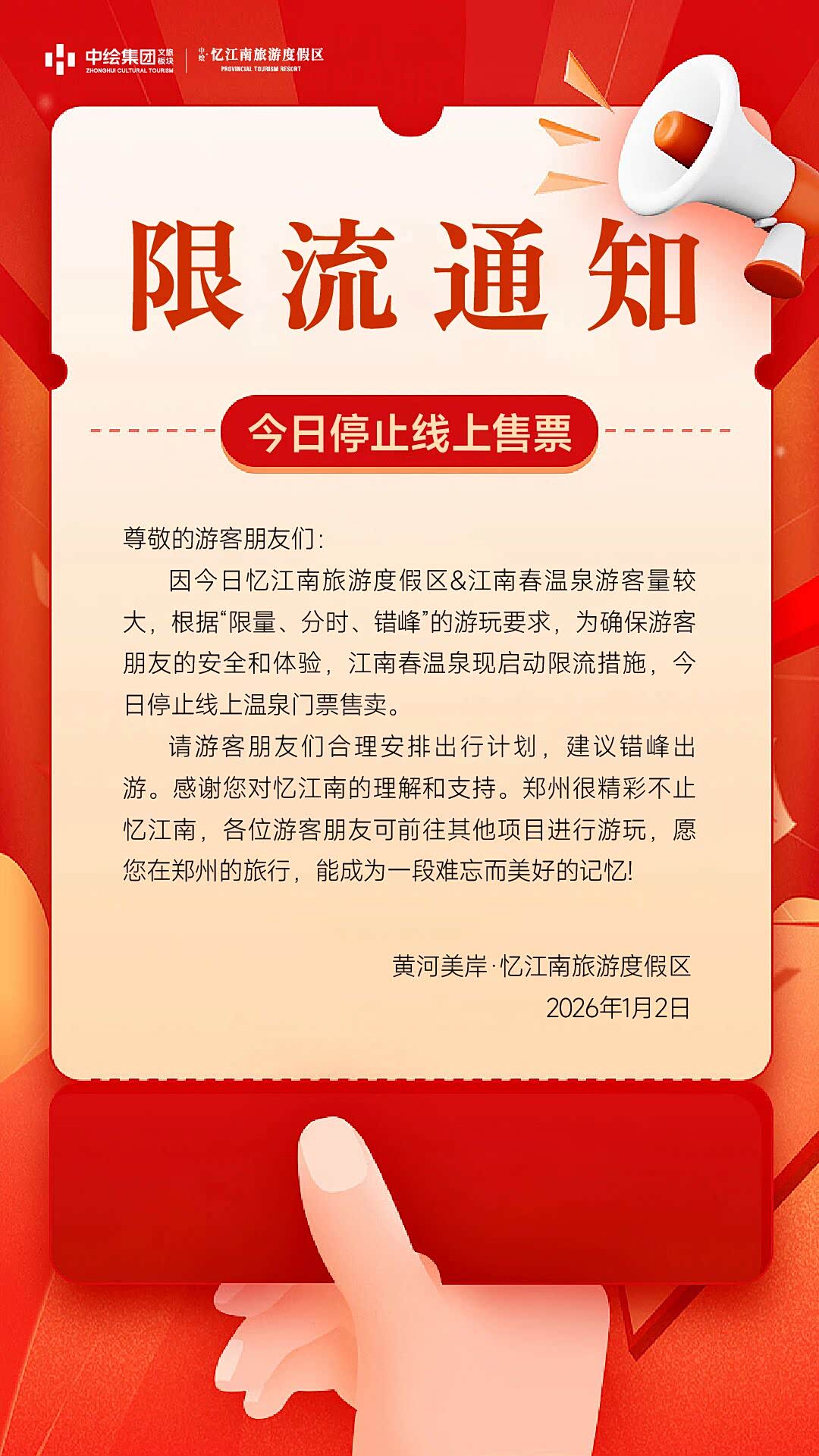 因今日忆江南旅游度假区&江南春温泉游客量较大,为确保游客朋友的安全和体验,江南春温泉现启动限流措施,今日停止线上温泉门票售卖。