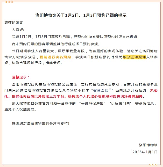 洛阳博物馆关于1月2日、1月3日预约已满的提示