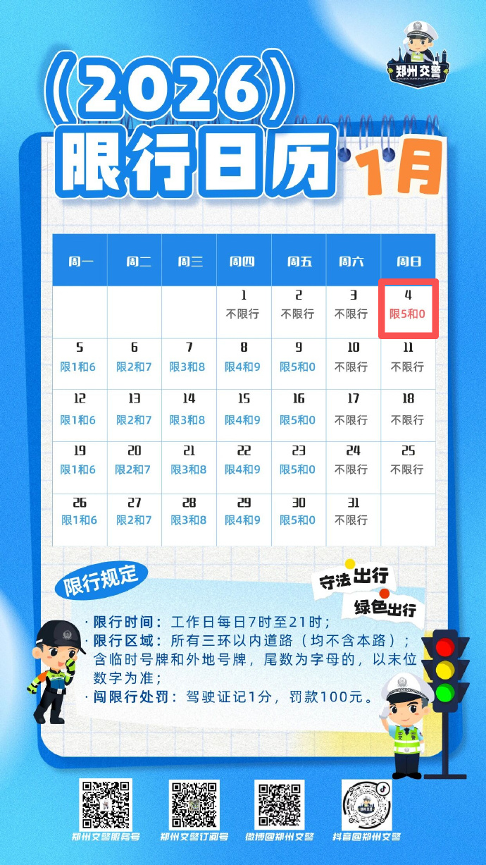 明天是2026年1月4日,星期日,郑州车辆限行时间7:00至21:00,尾数为5、0的机动车限行。