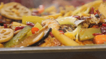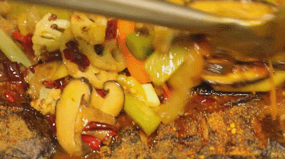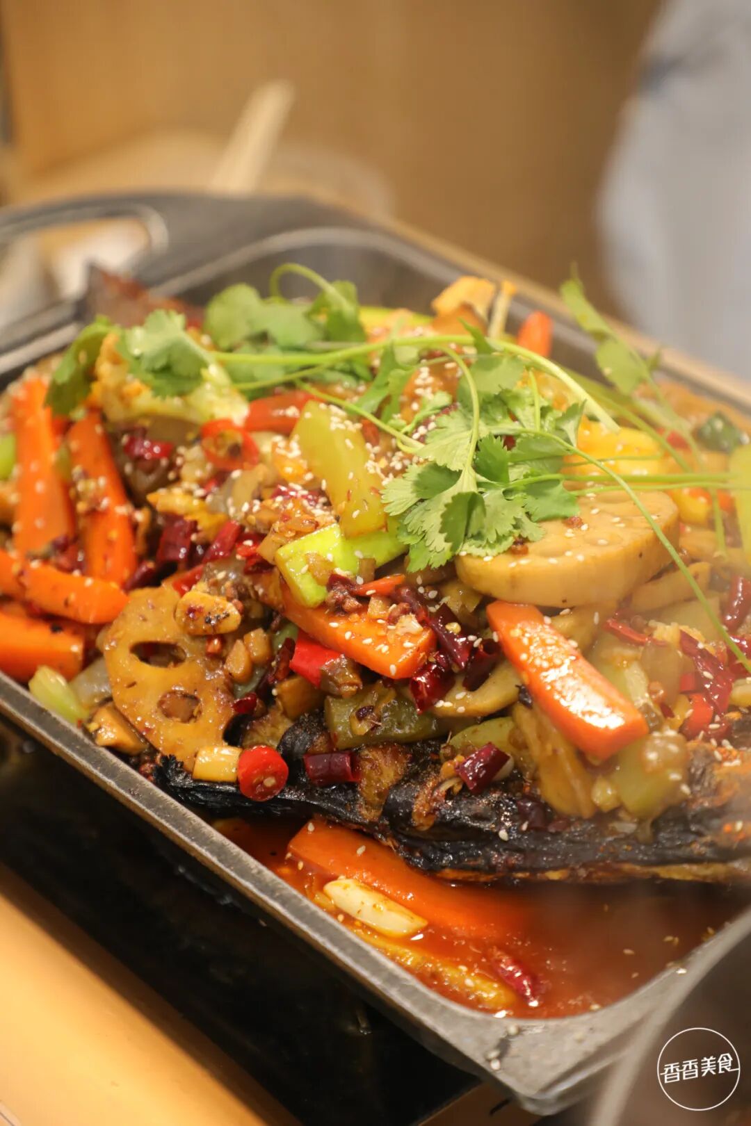 贵州烤鱼的独特之处,看到它端上桌的那一刻就感受到了。堆在烤鱼上的配菜,摞得满满当当。莲菜、芹菜、黄瓜条、胡萝卜、香菇、花菜……一眼能看见的配菜都有十几种,藏在配菜下的烤鱼若隐若现,在热气蒸腾下,麻辣鲜香各种滋味扑面而来。