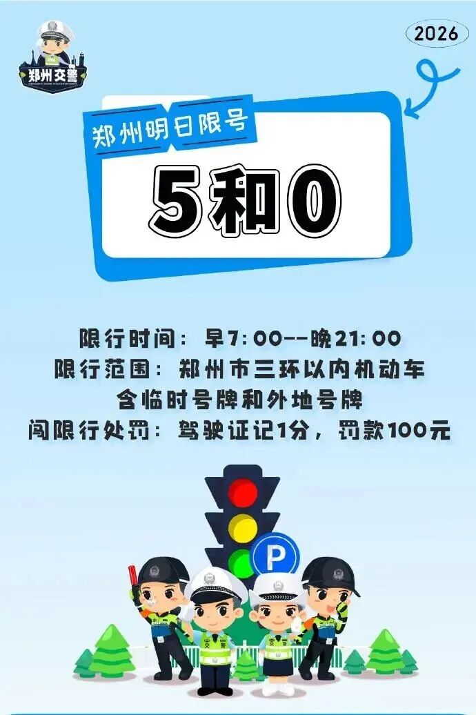 明天是2026年1月4日,星期日,郑州车辆限行时间7:00至21:00,尾数为5、0的机动车限行。 限行范围:郑州市三环以内机动车含临时号牌和外地号牌。