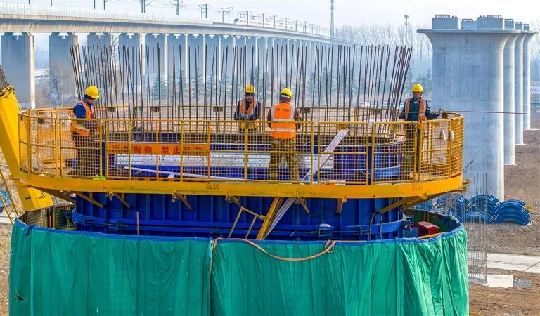 1月3日,在位于洛阳市的焦洛平高铁洛河特大桥建设现场,工人们坚守岗位进行桥墩施工,抓进度、保节点,全力保障工程按时推进。张怡熙 摄