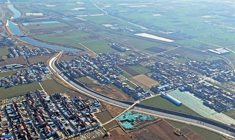 航拍下的国家重点工程西霞院水利枢纽输水及灌区工程孟州市片区城区段。该工程历经五年多建设,已全线完工并于2025年12月顺利通过验收,进入运行管理新阶段。白水平 摄
