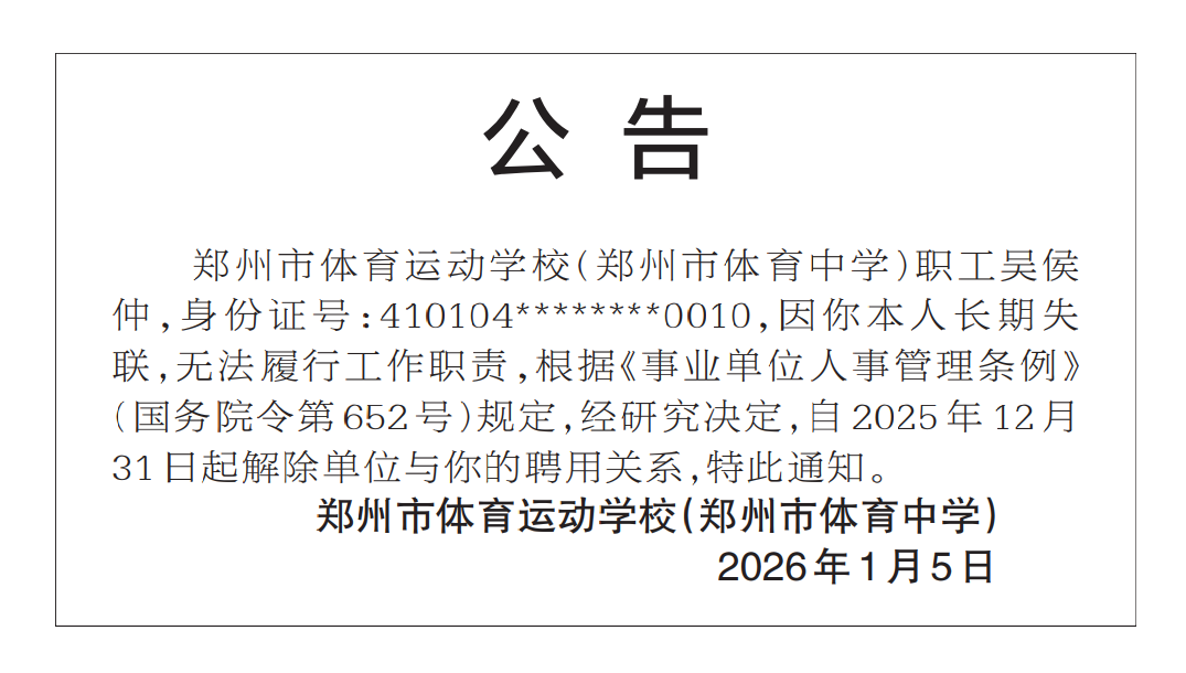 1月5日,郑州市体育运动学校(郑州市体育中学)在《郑州日报》发布辞退公告。