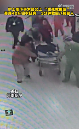 1月5日,在河南医药大学第一附属医院住院楼门前,一位年近80岁的预入院患者突发心脏骤停,住院助理随即紧急前往一楼介入科手术室呼救。刚下手术的介入科护士王琳鹏听到呼救后,与同事立刻飞奔至现场。