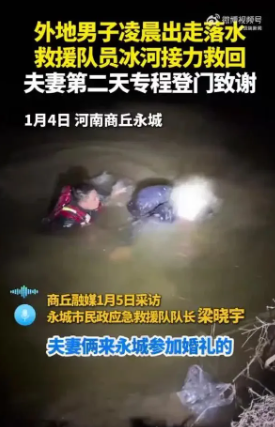 1月4日,一对外地年轻夫妻来商丘市永城市参加婚礼,丈夫因琐事凌晨2点从酒店出走落水。凌晨4点,永城市民政应急救援队接警后迅速集结,启动无人机展开拉网式搜索。经过一个多小时的争分夺秒搜索,终于在沱河定位到落水者。队员们毫不犹豫跳入冰冷河水,成功将人救起,还贴心进行心理疏导,为他找来被子取暖。次日,夫妻俩专程来到救援队表达感谢。