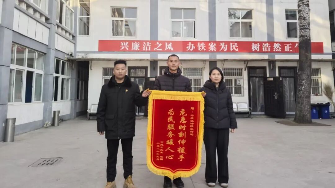 此前,执行干警李士宇、刘阳、宋义飞、田颖等人外出执行公务时,偶遇一对夫妻抱着晕厥的一岁孩子焦急求助。干警当即分工,刘阳驾驶警车护送孩子及家属赶往最近医院,其余干警继续执行任务。待孩子得到救治,他悄然返岗。孩子康复后,其父亲专程送锦旗致谢。干警们微笑着表示:“当时没想那么多,就一个念头,孩子不能等。换了谁,都会这么做!”
